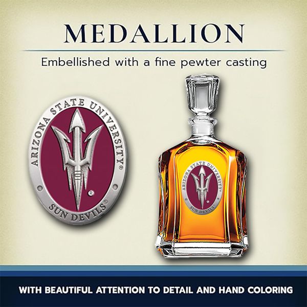 This 24-ounce glass decanter is embellished with a fine pewter casting of your favorite NCAA team. This may be paired with two Double Old-Fashioned glasses. A great addition to any home bar! Made in USA.