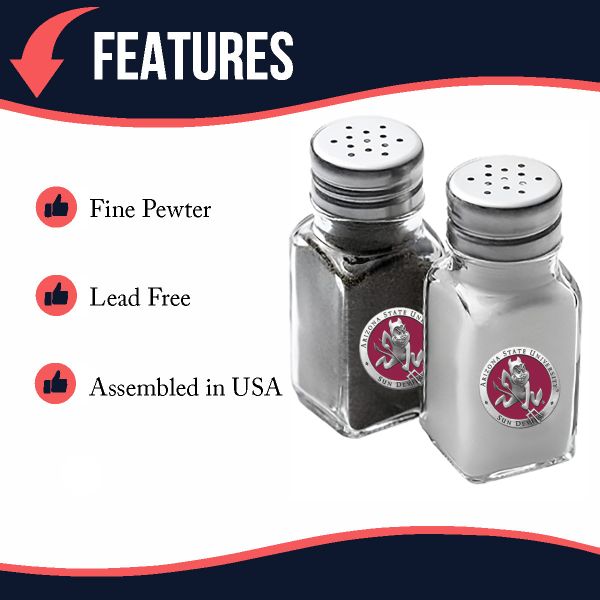 • CELEBRATE YOUR NCAA TEAM - This is a set of salt & pepper shakers with a fine pewter logo medallion of your NCAA team bonded to the side. Made in USA. Heritage Pewter has been hand-crafting fine pewter gifts since 1988. We offer an array of pewter products, ranging from barware to wind chimes, golf clubs to coffee mugs.