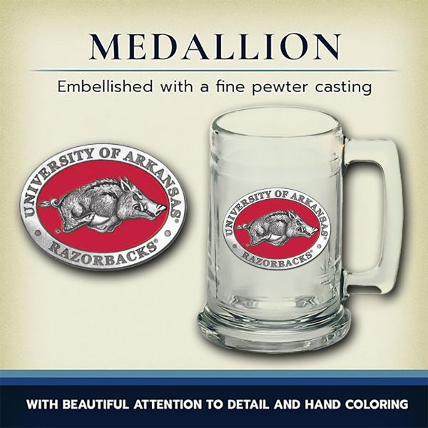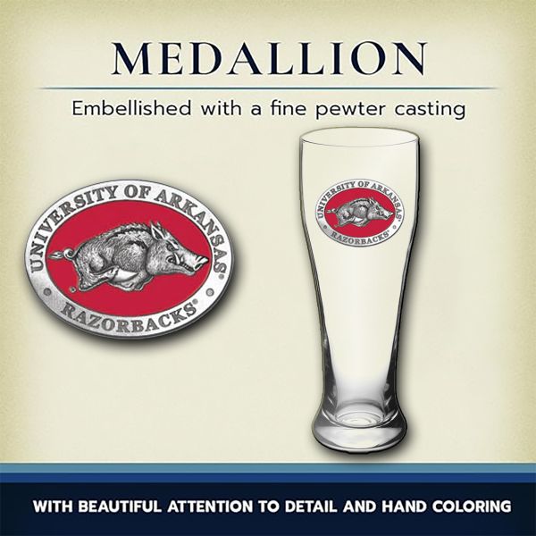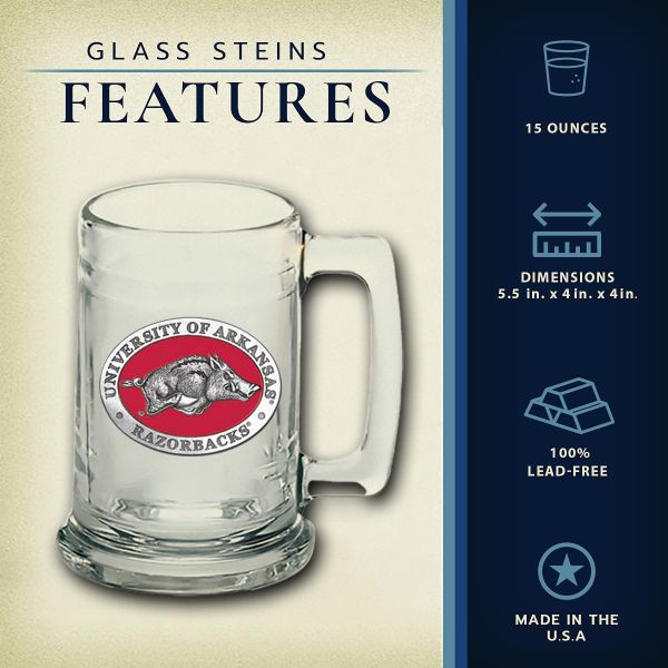 The Beer Chest Set comes with 2 - 20oz glass pilsners and 2 - 15oz glass steins. Each have a pewter medallion of your favorite NCAA team embellished to it.