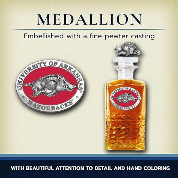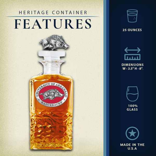 This 25-ounce glass decanter is embellished with a fine pewter casting and a 3-dimensional figure on top. It is match it with two Double Old-Fashioned glasses. A great addition to any home bar! Made in USA.