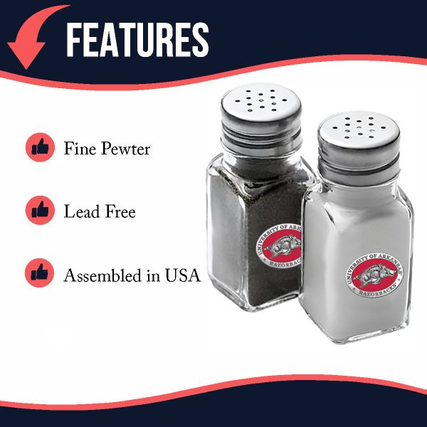 • CELEBRATE YOUR NCAA TEAM - This is a set of salt & pepper shakers with a fine pewter logo medallion of your NCAA team bonded to the side. Made in USA. Heritage Pewter has been hand-crafting fine pewter gifts since 1988. We offer an array of pewter products, ranging from barware to wind chimes, golf clubs to coffee mugs.