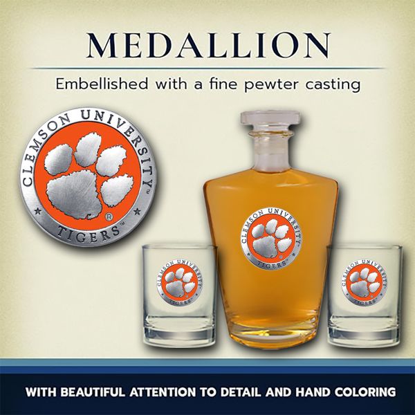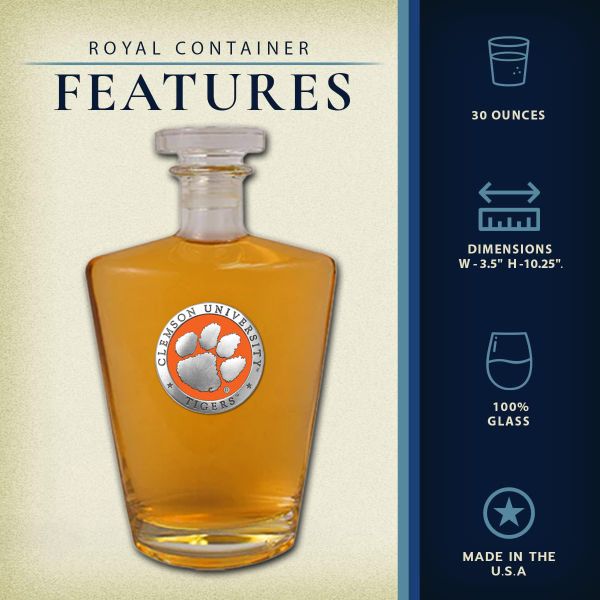This 30-ounce glass container is embellished with a hand-sculpted, highly detailed Fine Pewter casting making our Royal Container a great addition to any fan's collection. Comes paired with two Double Old-Fashioned glasses. Made in USA.