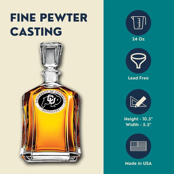 • PERFECT GIFT FOR ANY NCAA FAN - This 24-ounce glass decanter is embellished with a fine pewter casting. This may be paired with two Double Old-Fashioned glasses. A great addition to any home bar! Made in USA.