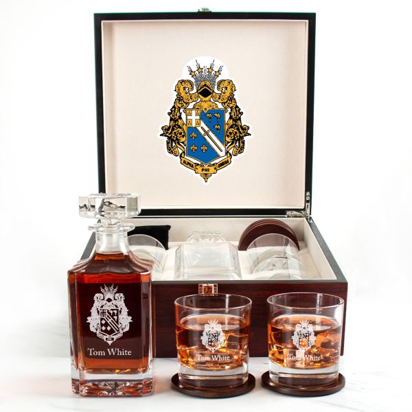Custom Engraved Alpha Phi Omega - Personalized Whiskey Decanter Set In Cherry Wood Gift Box - Coat of Arms
