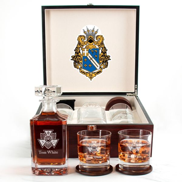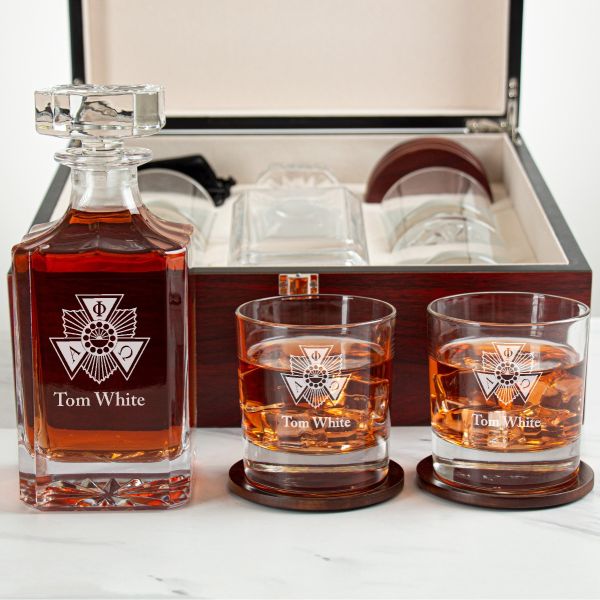 Custom Engraved Alpha Phi Omega - Personalized Whiskey Decanter Set In Cherry Wood Gift Box - Fraternity Badge Logo