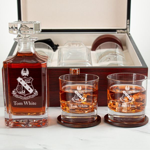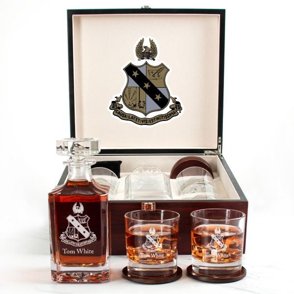 Custom Engraved Alpha Sigma Phi - Personalized Whiskey Decanter Set In Cherry Wood Gift Box - Coat of Arms