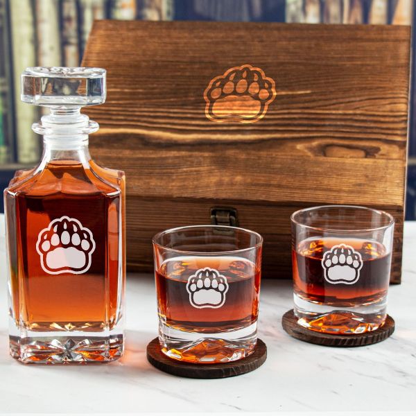 Custom Engraved Brown Bears Paw University - Personalized Whiskey Decanter Set In Wood Gift Box