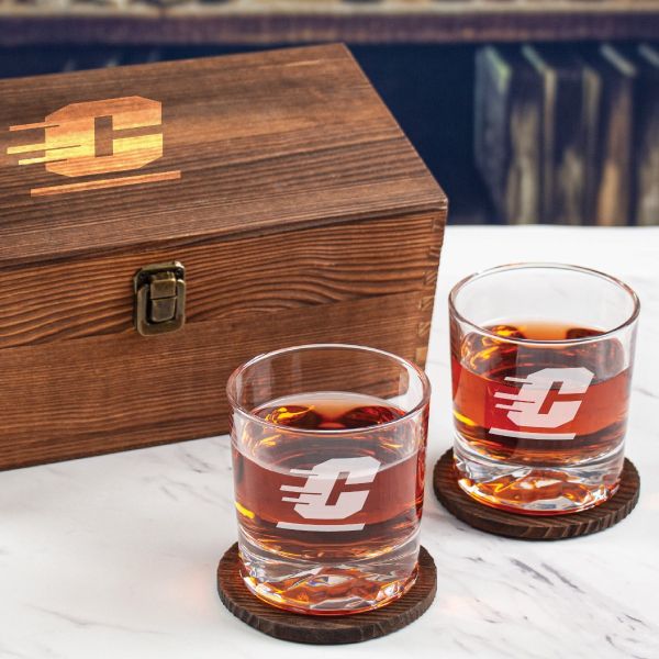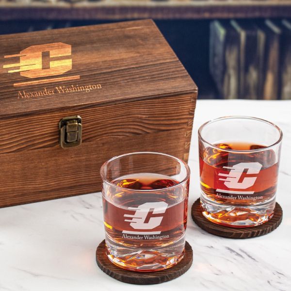 Custom Engraved Central Michigan Chippewas University - Personalized Whiskey Glasses In Wood Gift Box