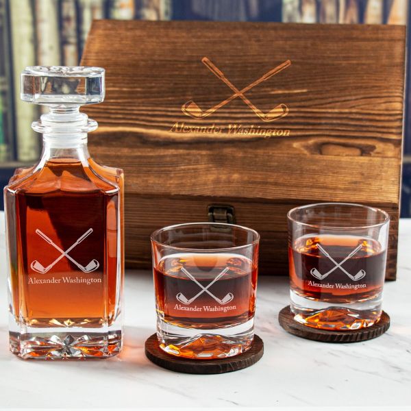 Custom Engraved Golfing Clubs Forming Cross Bones - Personalized Whiskey Decanter Set In Wood Gift Box