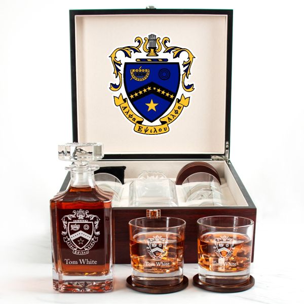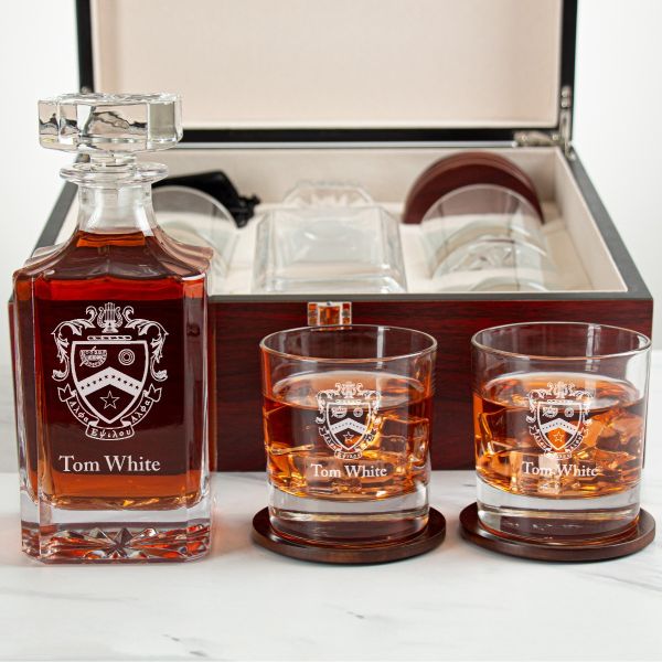 Custom Engraved Kappa Kappa Psi - Personalized Whiskey Decanter Set In Cherry Wood Gift Box - Coat of Arms