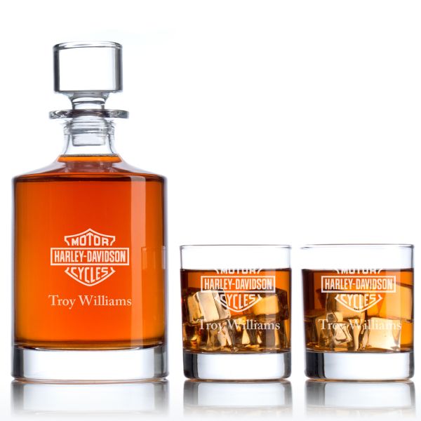 Custom Engraved Motor Harley Davidson Cycles Logo- Personalized Bellagio Decanter Set with Whiskey Glasses