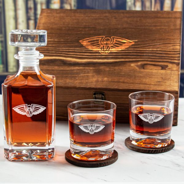 Custom Engraved Pelicans Emblem - Personalized Whiskey Decanter Set In Wood Gift Box