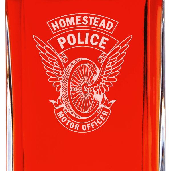 Custom Engraved Police Badges - Personalized Whiskey Decanter Set In Wood Gift Box - Homestead Police Winged Wheel