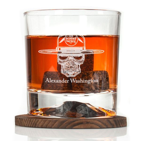 Custom Engraved - Police Badges - Personalized Whiskey Glasses In Wood Gift Box - US Border Patrol Skull