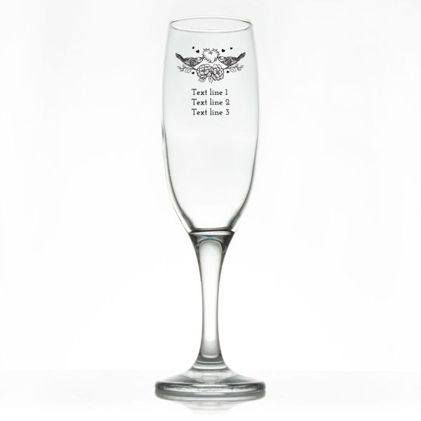 Custom Personalized Champagne Flutes - Birds on Flowers - Promotional Champagne Flutes In Bulk is available to buy in increments of 12