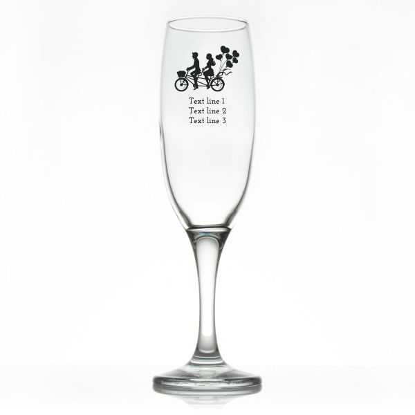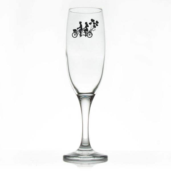 Custom Personalized Champagne Flutes - Couple Riding Bicycle - Promotional Champagne Flutes In Bulk is available to buy in increments of 12