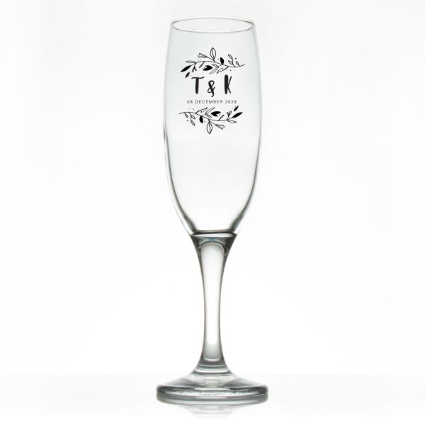 Custom Personalized Champagne Flutes - Initials with Leaves - Promotional Champagne Flutes In Bulk is available to buy in increments of 12