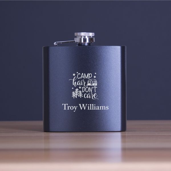 Engraved Camp Hair Do Not Care - Personalized 6oz Matte Black Powder Coated Stainless Steel FSK602