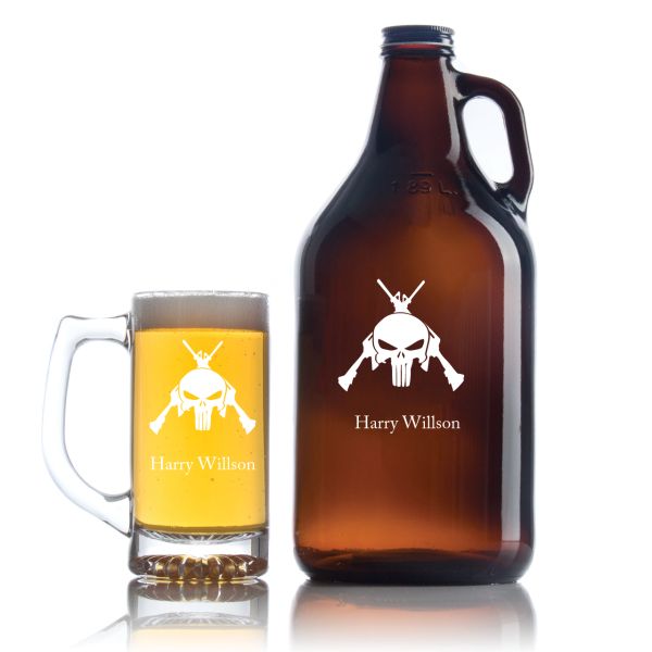 Engraved Punisher with Rifles - Personalized Amber Growler with Cap - Includes Beer Glass