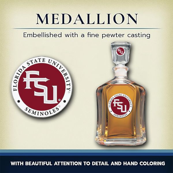 This 24-ounce glass decanter is embellished with a fine pewter casting of your favorite NCAA team. This may be paired with two Double Old-Fashioned glasses. A great addition to any home bar! Made in USA.