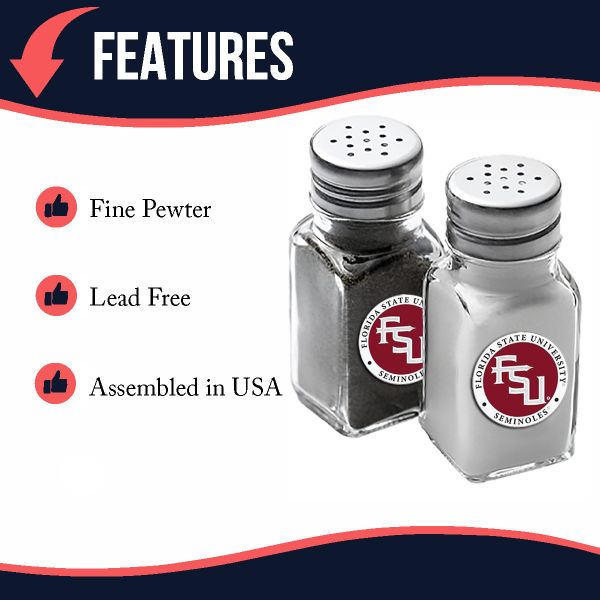 • CELEBRATE YOUR NCAA TEAM - This is a set of salt & pepper shakers with a fine pewter logo medallion of your NCAA team bonded to the side. Made in USA. Heritage Pewter has been hand-crafting fine pewter gifts since 1988. We offer an array of pewter products, ranging from barware to wind chimes, golf clubs to coffee mugs.