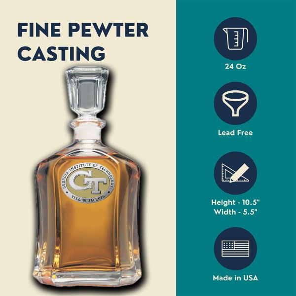 This 24-ounce glass decanter is embellished with a fine pewter casting. Comes paired with two Double Old-Fashioned glasses within a decorative chest with a pewter medallion with your favorite NCAA team. A great addition to any home bar! Made in USA.