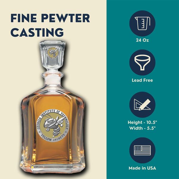 This 24-ounce glass decanter is embellished with a fine pewter casting. Comes paired with two Double Old-Fashioned glasses within a decorative chest with a pewter medallion with your favorite NCAA team. A great addition to any home bar! Made in USA.