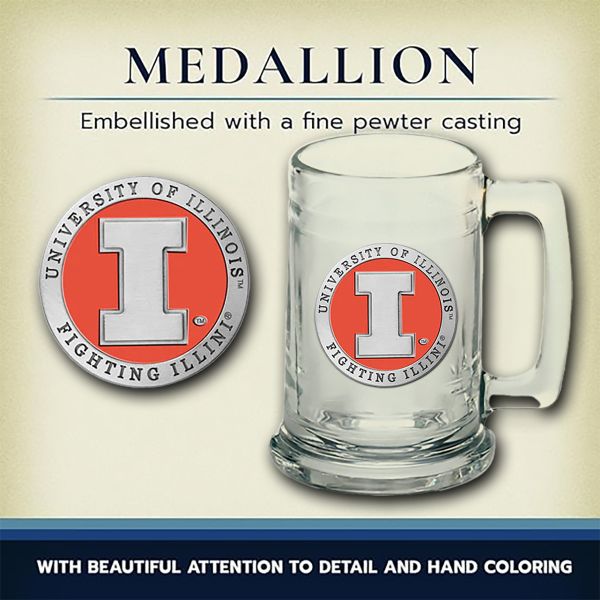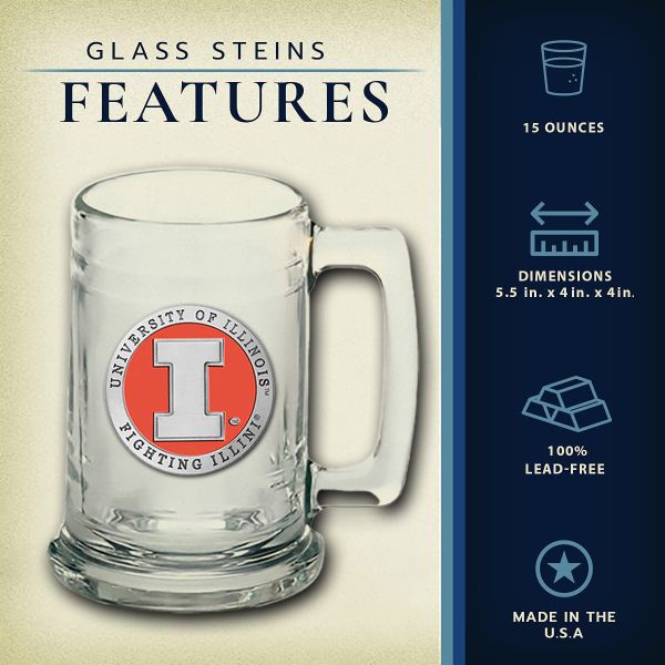 The Beer Chest Set comes with 2 - 20oz glass pilsners and 2 - 15oz glass steins. Each have a pewter medallion of your favorite NCAA team embellished to it.