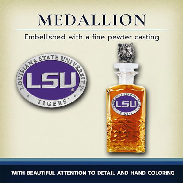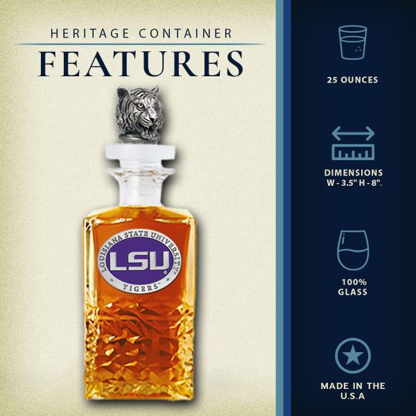 This 25-ounce glass decanter is embellished with a fine pewter casting and a 3-dimensional figure on top. It is match it with two Double Old-Fashioned glasses. A great addition to any home bar! Made in USA.