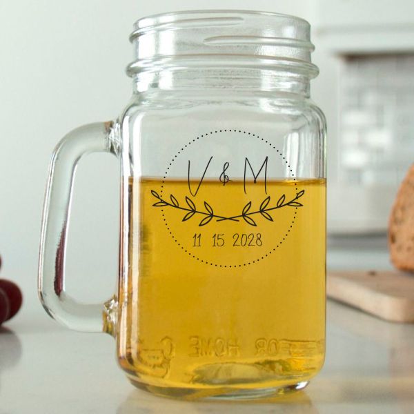 Mason Mug - Handwritten Initials Laurel Leaf Drawing - Personalized Mason Jar 16oz is available to buy in increments of 12