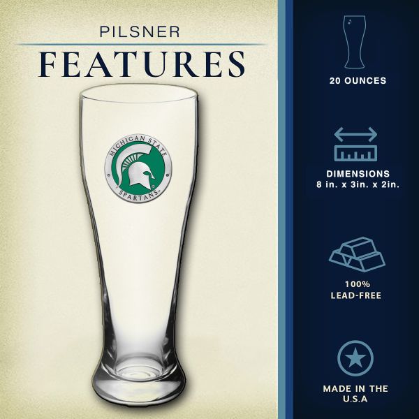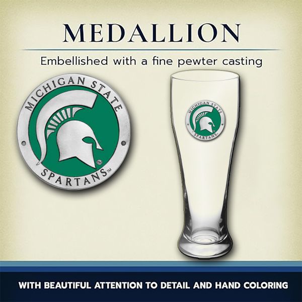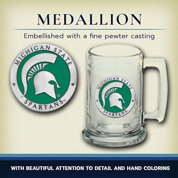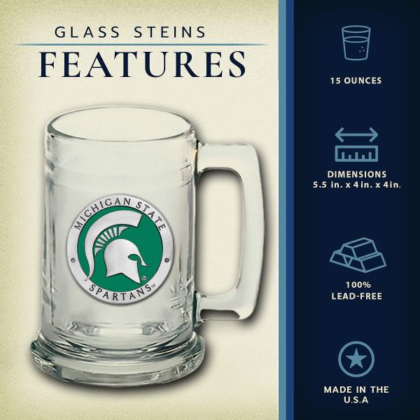 The Beer Chest Set comes with 2 - 20oz glass pilsners and 2 - 15oz glass steins. Each have a pewter medallion of your favorite NCAA team embellished to it.