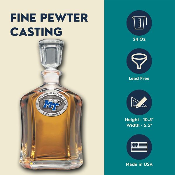 • PERFECT GIFT FOR ANY NCAA FAN - This 24-ounce glass decanter is embellished with a fine pewter casting. Comes paired with two Double Old-Fashioned glasses within a decorative chest with a pewter medallion with your favorite NCAA team. A great addition to any home bar! Made in USA.