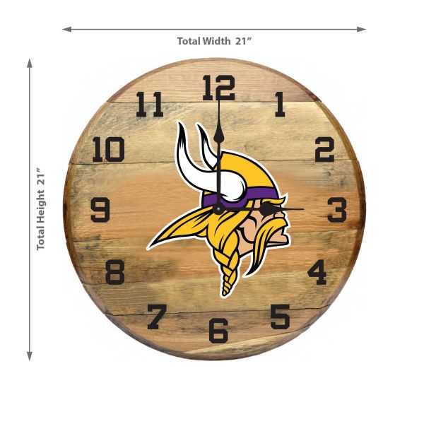 It's game time with this officially licensed Oak Barrel Clock. Made from an authentic Kentucky oak charred whiskey barrel top, this rustic-style clock is one of a kind and looks great in your living room or fan cave. The team logo is applied by injecting UV resistant ink into the oak and then sealing. The clock measures 21 inches in diameter and features a Quartz Clock Mechanism. AA Battery not included. This product is officially licensed by the NFL and is made in the USA.