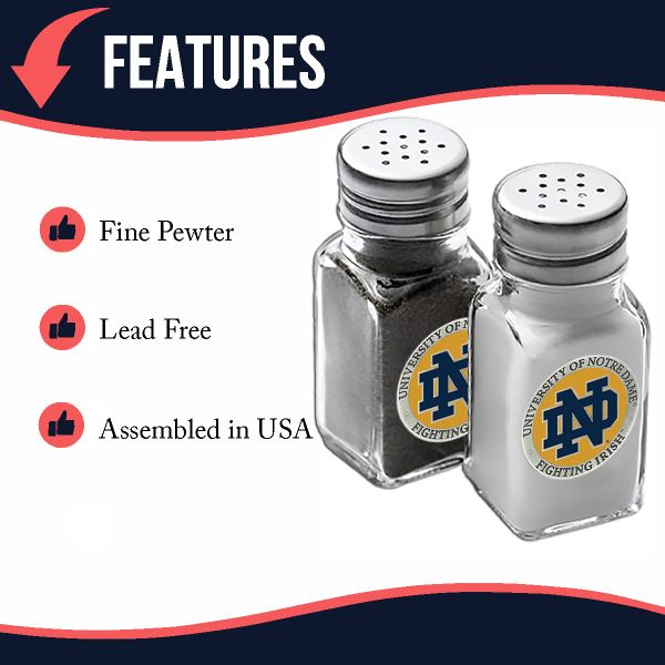 • CELEBRATE YOUR NCAA TEAM - This is a set of salt & pepper shakers with a fine pewter logo medallion of your NCAA team bonded to the side. Made in USA. Heritage Pewter has been hand-crafting fine pewter gifts since 1988. We offer an array of pewter products, ranging from barware to wind chimes, golf clubs to coffee mugs.