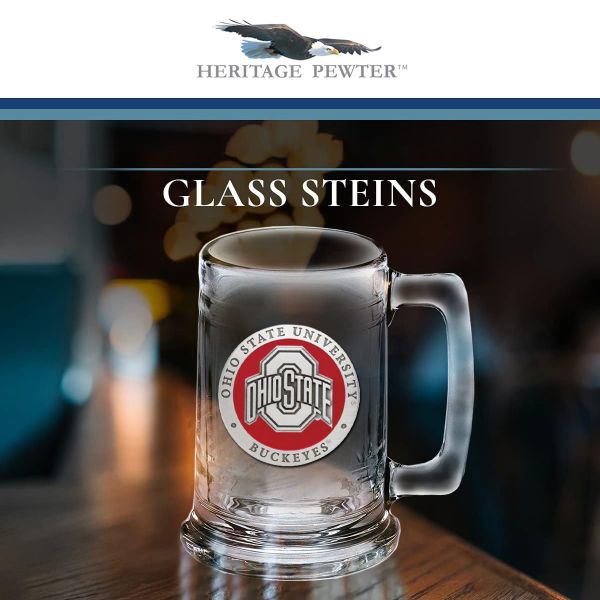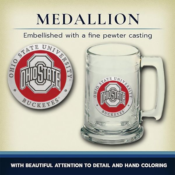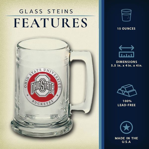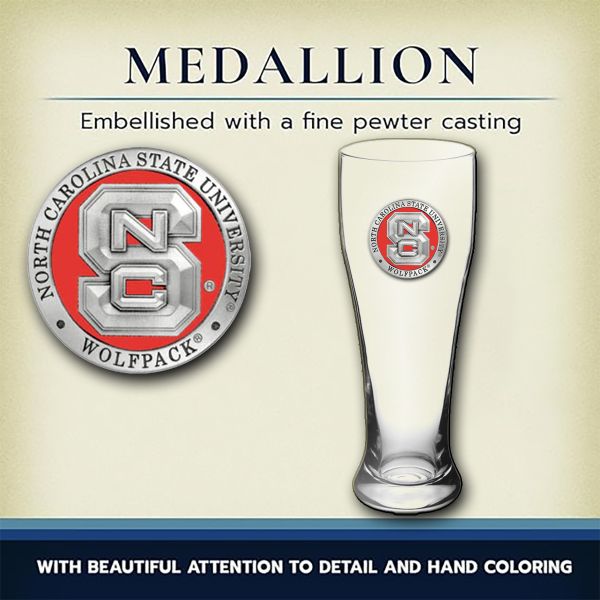 The Beer Chest Set comes with 2 - 20oz glass pilsners and 2 - 15oz glass steins. Each have a pewter medallion of your favorite NCAA team embellished to it.