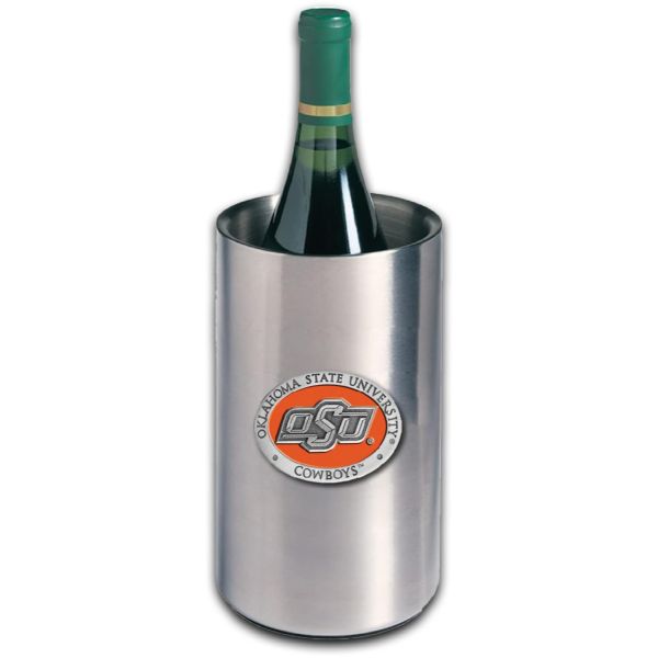 This Wine Chest Set comes with 2 - 12 oz Stemmed Goblets with a pewter medallion bonded to it, a double-wall insulated stainless steel chiller also with a pewter logo medallion bonded to the front.