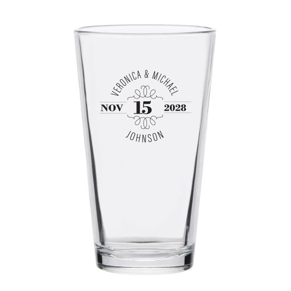 Personalized 16 oz Custom Pint Glasses - Deco Names and Date Circle Stamp - Customized Pint Glasses