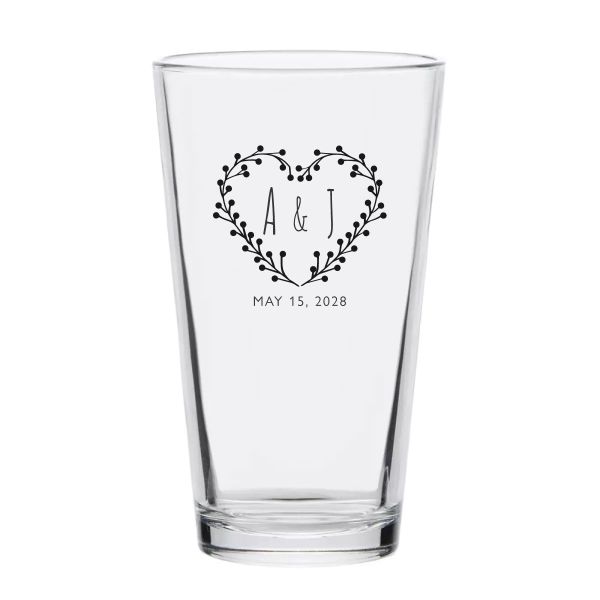 Personalized 16 oz Custom Pint Glasses - Heart Flower Wreath with Initials - Customized Pint Glasses is available to buy in increments of 12