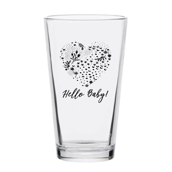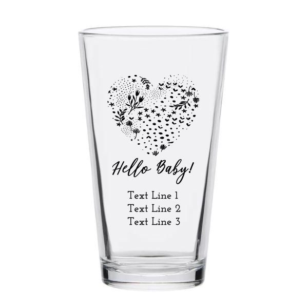 Personalized 16 oz Custom Pint Glasses - Hello Baby Heart with Stars and Flowers - Customized Pint Glasses is available to buy in increments of 12