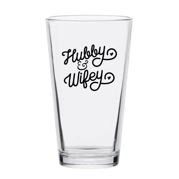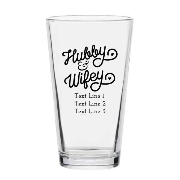 Personalized 16 oz Custom Pint Glasses - Hubby & Wifey - Customized Pint Glasses is available to buy in increments of 12