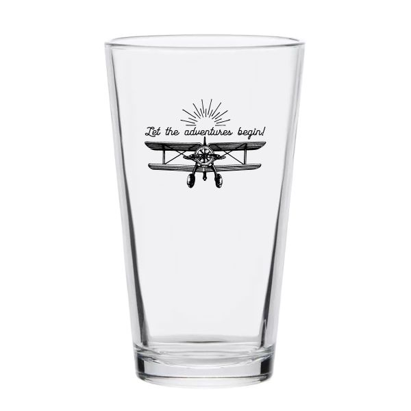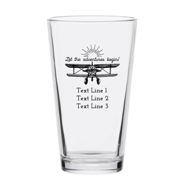 Personalized 16 oz Custom Pint Glasses - Let the Adventures Begin - Airplane - Customized Pint Glasses is available to buy in increments of 12