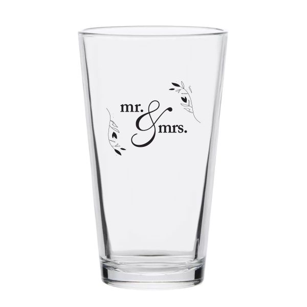 Personalized 16 oz Custom Pint Glasses - Mr. & Mrs. Circle Stamp with Leaves- Customized Pint Glasses is available to buy in increments of 12