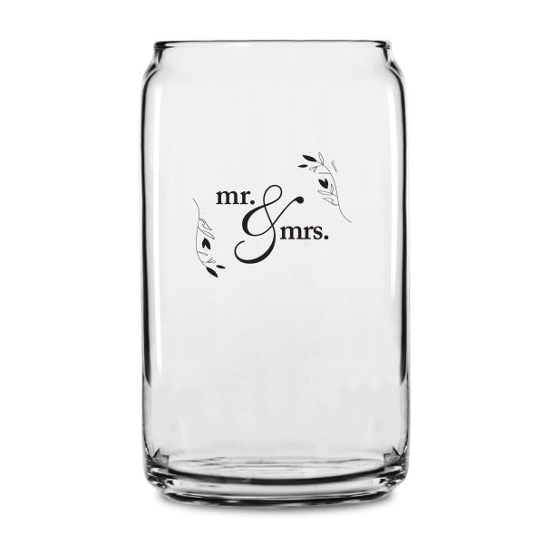 Personalized 16 oz Custom Can Shaped Glass - Mr. & Mrs. Circle Stamp with Leaves - Customized Can Glasses
