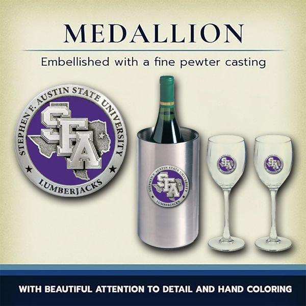 This Wine Chest Set comes with 2 - 12 oz Stemmed Goblets with a pewter medallion bonded to it, a double-wall insulated stainless steel chiller also with a pewter logo medallion bonded to the front.