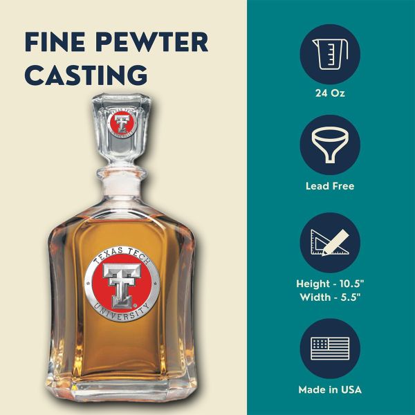• PERFECT GIFT FOR ANY NCAA FAN - This 24-ounce glass decanter is embellished with a fine pewter casting. Comes paired with two Double Old-Fashioned glasses within a decorative chest with a pewter medallion with your favorite NCAA team. A great addition to any home bar! Made in USA.