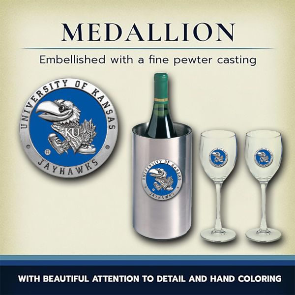 This Wine Chest Set comes with 2 - 12 oz Stemmed Goblets with a pewter medallion bonded to it, a double-wall insulated stainless steel chiller also with a pewter logo medallion bonded to the front.