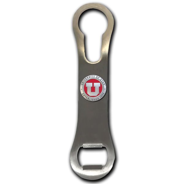 This bottle opener is solid stainless steel with a decorative fine pewter accent casting. The hole opposite the opener is for hanging on a peg.
