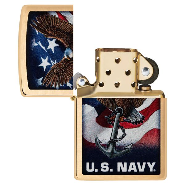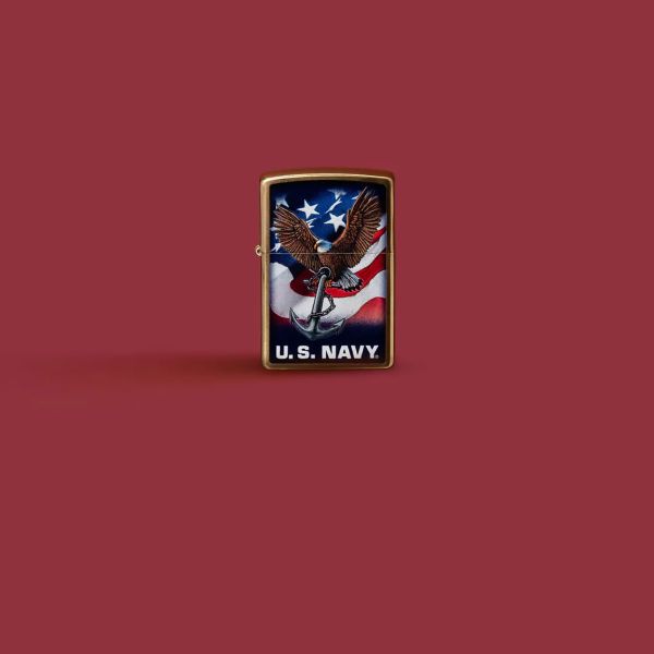 Anchored by the US Navy® wordmark, this patriotic Brushed Brass lighter features the iconic eagle and anchor over a billowing American flag in a timeless Color Image design. Comes packaged in a gift box. For optimal performance, fill with Zippo lighter fuel.