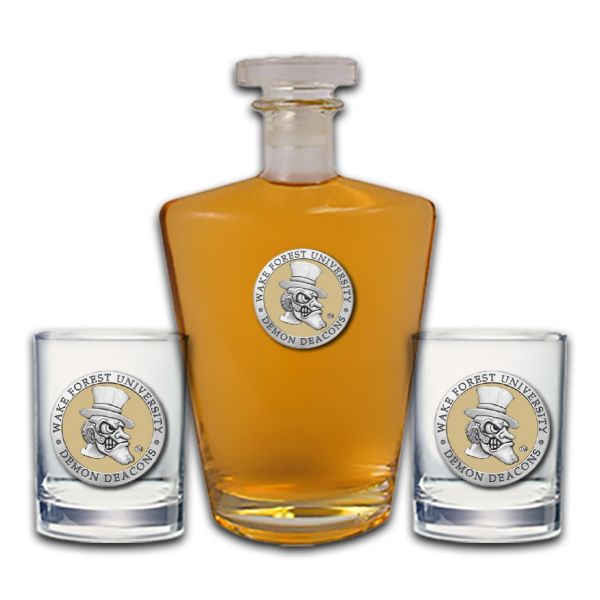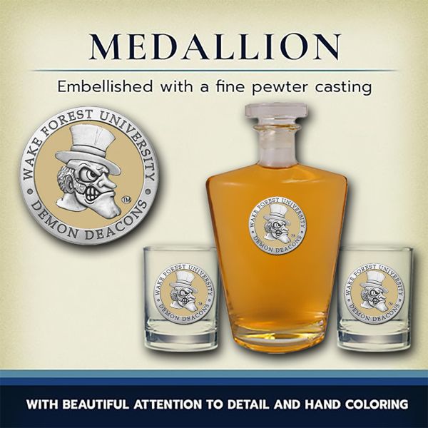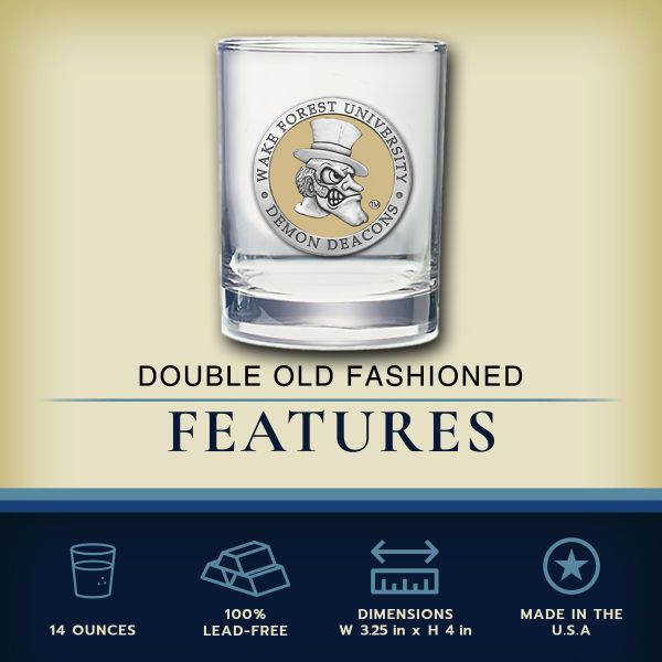 This 30-ounce glass container is embellished with a hand-sculpted, highly detailed Fine Pewter casting making our Royal Container a great addition to any fan's collection. Comes paired with two Double Old-Fashioned glasses. Made in USA.
