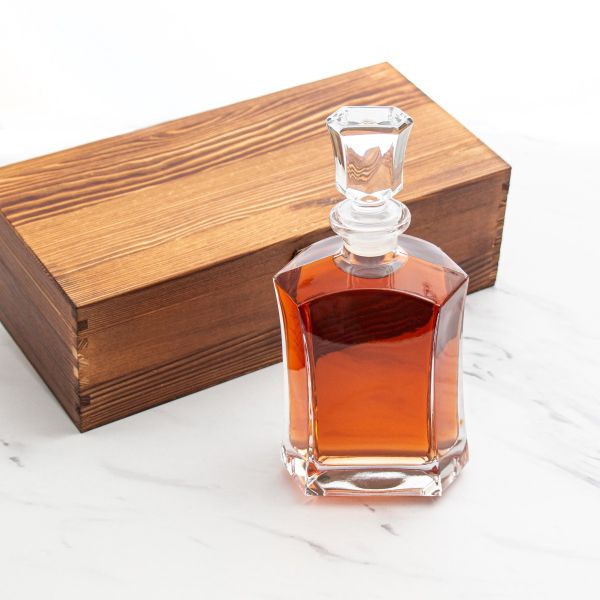 This decanter presented in a wood box offers a refined and luxurious packaging solution that elevates the overall experience. The rustic natural wood adds warmth and sophistication, making it perfect for corporate gifts, special occasions, or premium branding. The combination of glass and wood creates a timeless aesthetic that speaks to quality and craftsmanship.